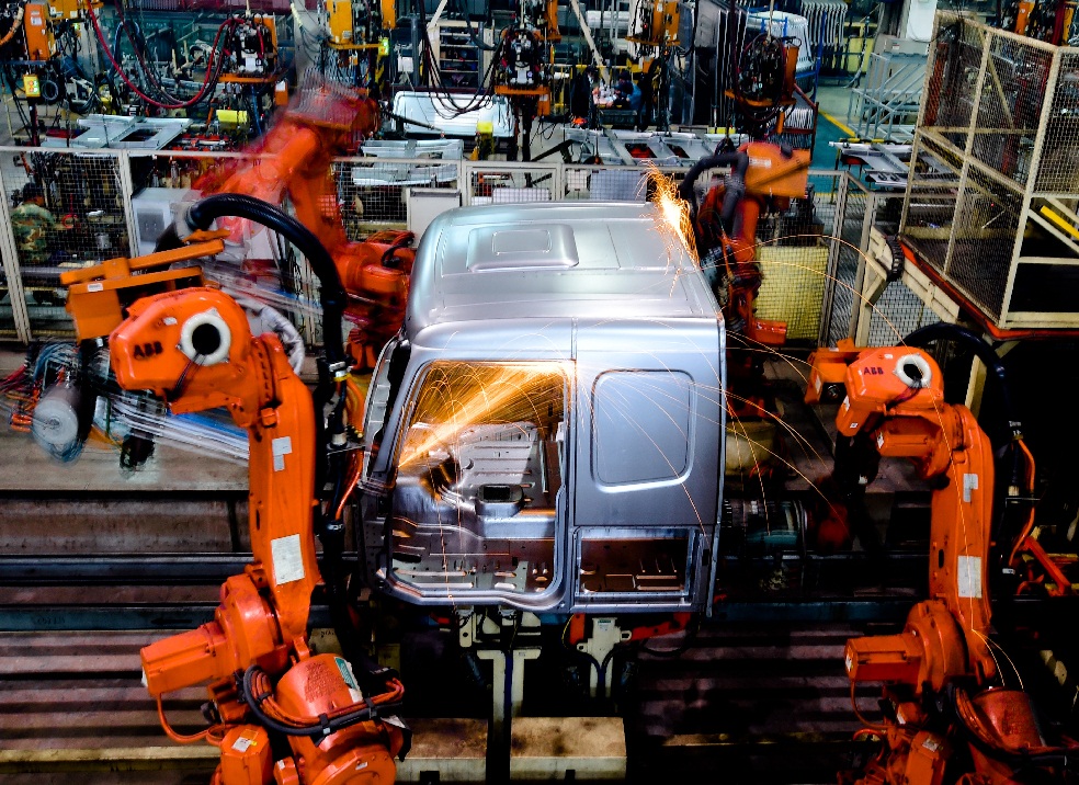 A robot welds parts at Jinan Truck Company of China National Heavy Duty Track Group in Jinan city, capital of east China's Shandong Province on June 17, 2015. (Xinhua/Guo Xulei)