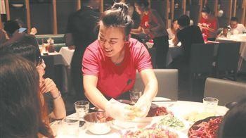 A waitress peels crayfish for customers. (Photo/Workers' Daily)